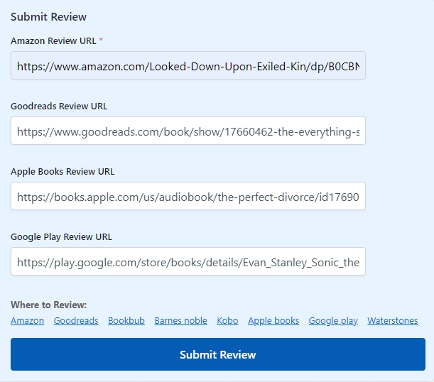 Thank you for reading the book! Once you have finished reading and posted your review on retail sites (like Amazon or Goodreads), the final step is to submit your review links to your dashboard.