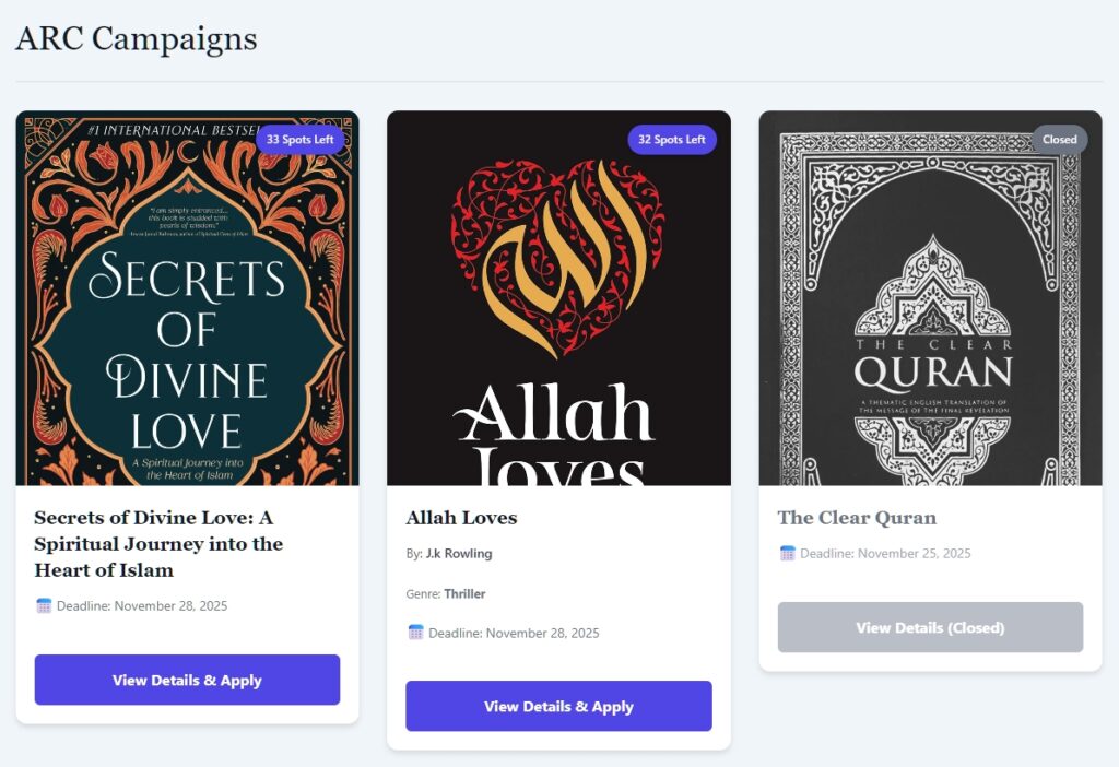 - Stats Overview: Cards showing “Total ARCs Received”, “Pending Reviews”, and “Reviews Submitted”.